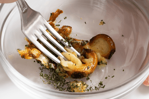 Затем остудить, развернуть и выдавить мякоть чесночных зубчиков в миску. Хорошо размять ее вилкой в пюре, добавив немного свежего розмарина.