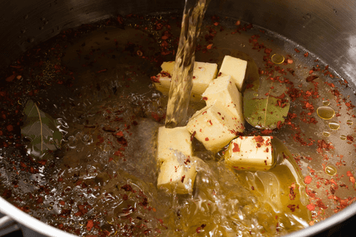 Вино, бульон, 60 мл оливкового масла, 1 столовую ложку соли, сок целого лимона, сливочное масло, перец чили и лавровый лист выложить в кастрюлю такого размера, чтобы в нее влез целиком кочан капусты и еще осталось немного места по краям.