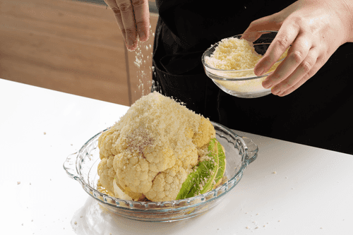 Посыпать тертым пармезаном. Увеличить температуру в духовке до 250 градусов. Запекать капусту на среднем уровне духовки 30 минут.