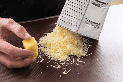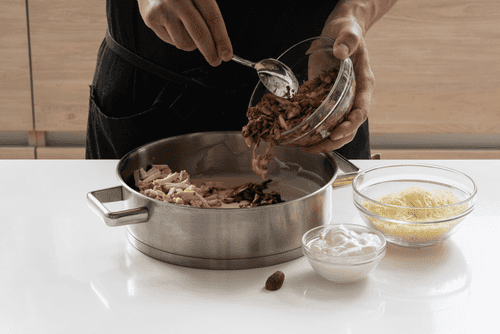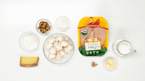 Смешать молочный соус с курицей и грибами, добавить сметану и часть сыра, посолить и поперчить по вкусу, добавить мускатный орех.