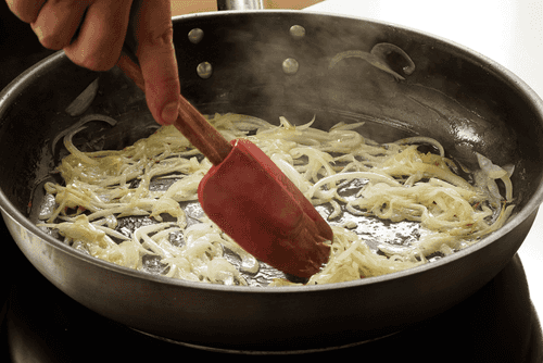 На сковороде разогреть растительное масло и обжарить на нем лук до золотистого цвета.