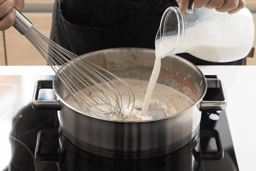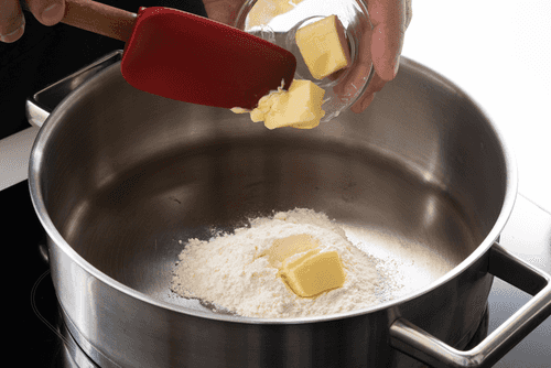 В сотейнике растопить сливочное масло, смешать на среднем огне с мукой.