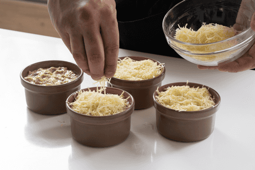 Разложить жюльен по кокотницам, посыпать сыром и отправить в духовку, разогретую до 200 градусов, на 8–10 минут или пока сыр не превратится в приятную золотистую корочку.