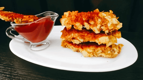 Куриные стрипсы в ароматной панировке готовы. Подавать с любимым соусом.