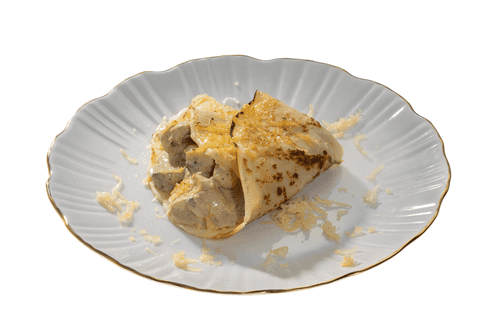 Готовые блины свернуть в треугольники и выложить в них начинку. Сыр гауда натереть на средней терке и посыпать им блины.