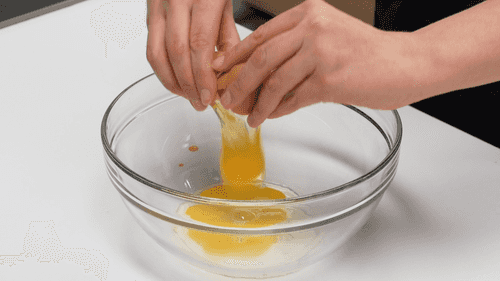 Приготовить блинное тесто. Яйца помыть и разбить в большую миску, взбить вилкой или венчиком.