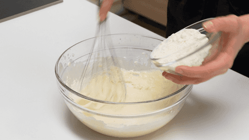 Добавить 2/3 части пшеничной муки и снова хорошо взбить, чтобы не было комочков.