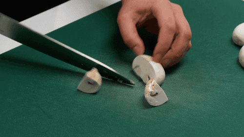 Приготовить начинку. Грибы шампиньоны помыть, крупные нарезать на 8 частей, мелкие на 4. Курицу нарезать на кубики 1х1 см и обсушить. Лук и чеснок нашинковать.