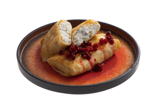 Обжарить блины на подсолнечном масле с двух сторон до золотистого цвета. Затем запечь в духовке 4 минуты при температуре 180 градусов. Подавать с моченой брусникой.