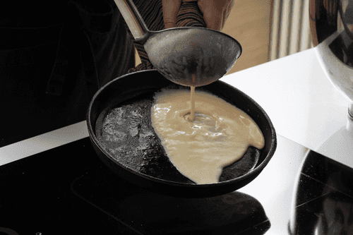 Разогреть блинную сковородку — для первого блина можно смазать ее растительным маслом, а последующие можно жарить и без него. Вылить на сковородку немного теста и распределить его по всей поверхности.