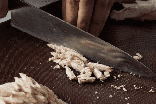 Лук нашинковать и смешать с курицей, сыром фета и йогуртом.