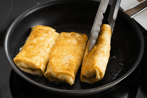 Жарить около 2 минут на среднем огне, затем перевернуть и жарить еще 1 минуту. Таким образом поступить со всем тестом.
