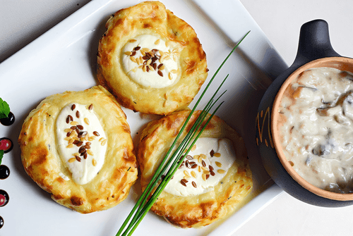 Картофель очистить и отварить до готовности. Лук мелко нарезать и обжарить до золотистого цвета. Горячий картофель растолочь, добавить масло, затем муку, яйцо, соль, пассерованный лук и тщательно перемешать до однородной массы. Из полученного теста сформовать двенадцать круглых лепешек толщиной 1,5 см, в середину каждой выложить сметану.