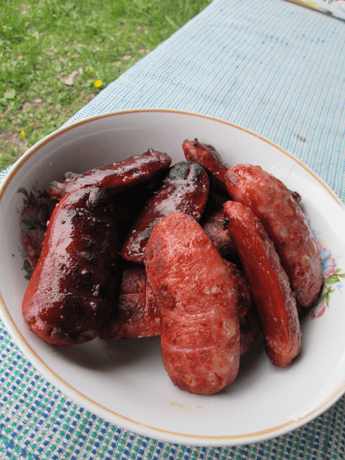 Надрезать сосиски с обеих сторон поперек на 3–4 части, обжарить на сковороде в масле в течение 2–3 минут, затем положить на сковороду помидоры, нарезанные тонкими ломтиками, подсоленные и посыпанные перцем, и вместе с ними вновь обжарить сосиски в течение 2–3 минут.