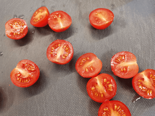 Помидоры черри нарезать половинками.