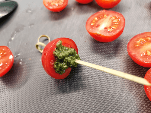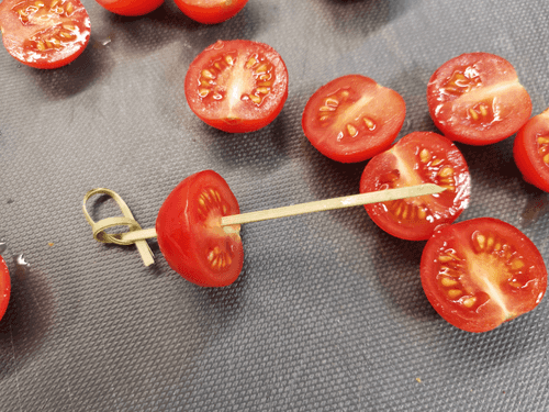 Завершить канапе второй половинкой помидора.