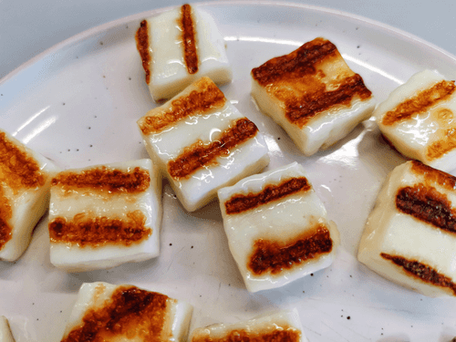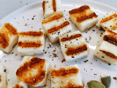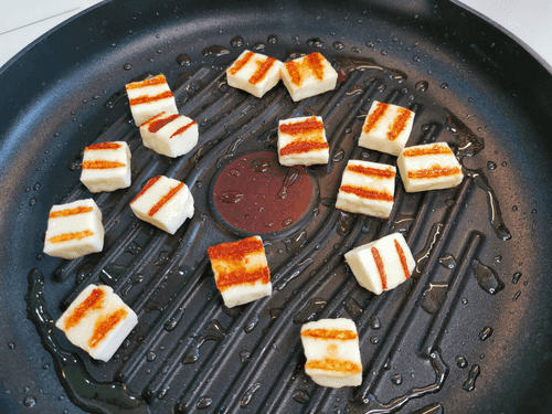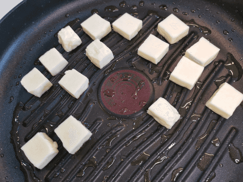 Нарезать сыр квадратными ломтиками и отправить на раскаленную сковороду, смазанную оливковым маслом.