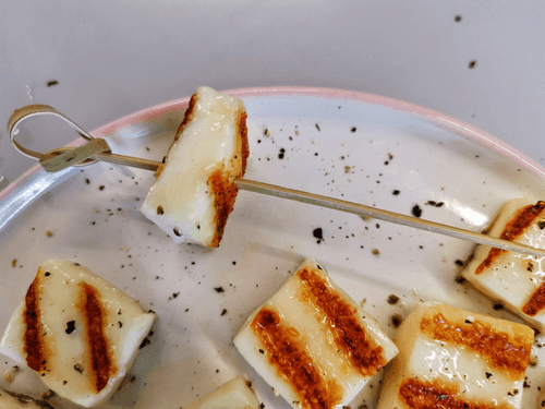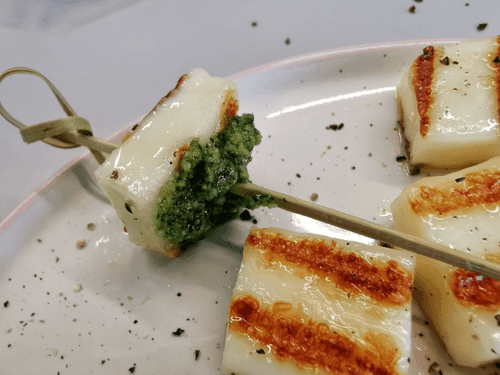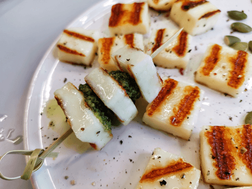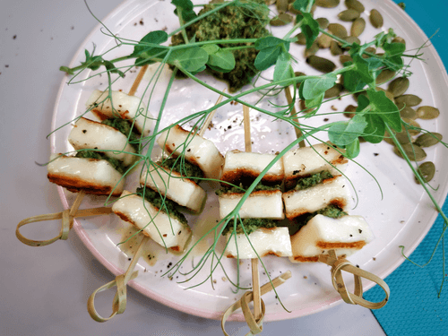 Канапе из сыра халуми с соусом песто