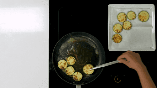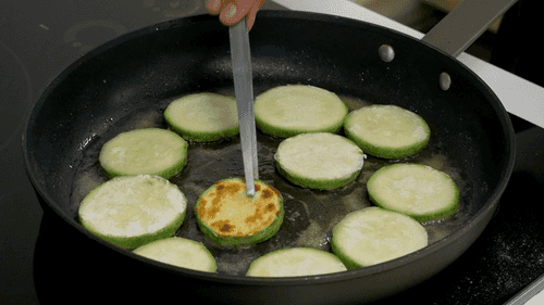 Выложить кабачки на сковородку, стряхнув лишнюю муку, и жарить по 2–3 минуты на каждой стороне, до золотистой корочки.