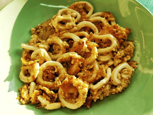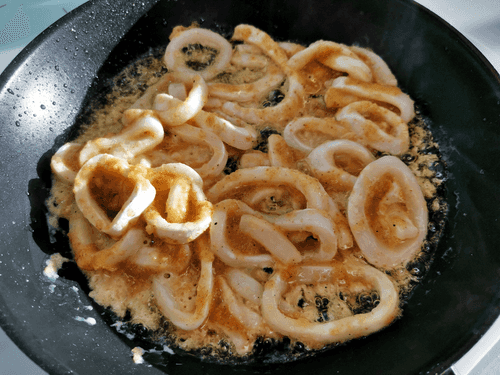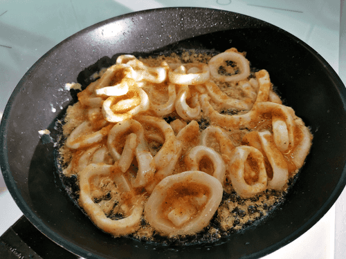 Отправить кольца кальмара на раскаленную сковороду, в кипящее масло.