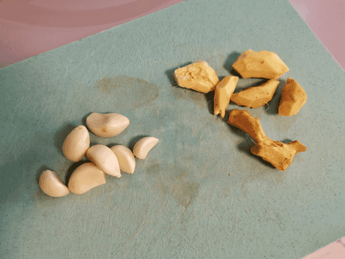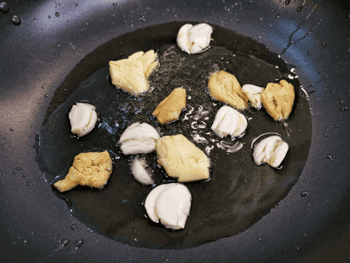 Имбирь и чеснок отправить в кипящее масло и готовить на большом огне.