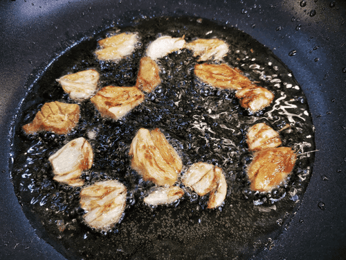 Как только нижняя сторона подрумянится, перевернуть. Затем, через 2 минуты, удалить имбирь с чесноком: они больше не понадобятся, масло впитало их сок.