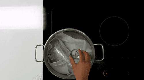 На дно большой кастрюли выложить кухонное полотенце, на него выложить мясо и залить водой.
