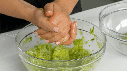 Тщательно отжать сок и переложить кабачки в чистую миску.
