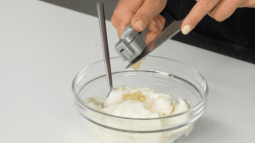 Для крема смешать творожный сыр, сметану, чеснок, раздавленный через пресс, соль и перец.