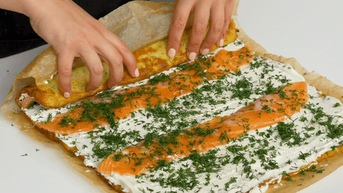 Готовый кабачковый корж снять с пергамента. Смазать корж кремом, сверху выложить рыбу и посыпать укропом.