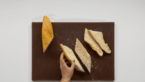 Багет разрезать на несколько больших кусков и их разрезать вдоль.