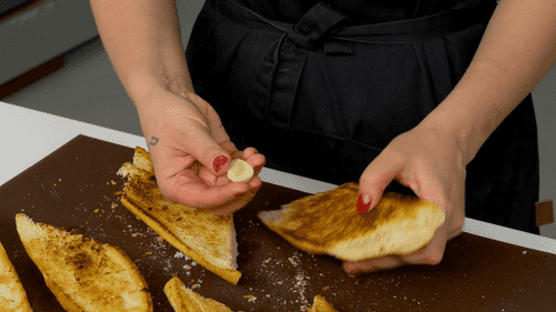 Натереть подсушенный хлеб чесноком.