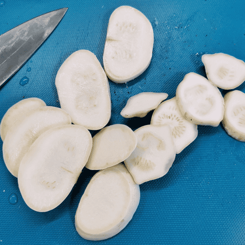 Патиссоны нарезать слайсами толщиной около 5 мм.