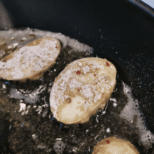 Поступить так со всеми патиссонами и отправить их в кипящее масло. Обжаривать по 2–3 минуты на сильном огне каждую сторону до румяной корочки.