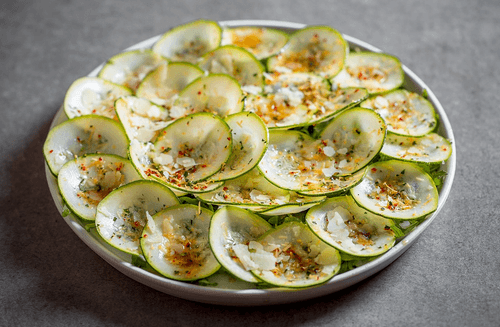 Молодой кабачок — для самых разных сырых закусок овощ практически идеальный: в нем есть текстура, но нет грубости, есть незамутненная свежесть, но без навязчивой травяной составляющей, как, например, бывает у зеленой фасоли или спаржи. Тут украшением карпаччо служат наструганный пармезан и капля трюфельного масла — с ними кабачок расцветает и переходит в разряд праздничных блюд. Найти нежный, молочной спелости кабачок зимой получается не всегда, но его легко заменить на всесезонный и вечно молодой цукини. Рецепт от Сергея Кондакова, шеф-повара ресторана Rossini.