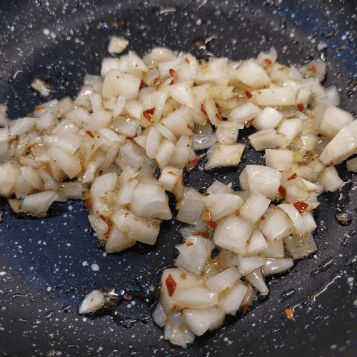 Пассеровать лук на раскаленной сковороде в течение 2 минут.