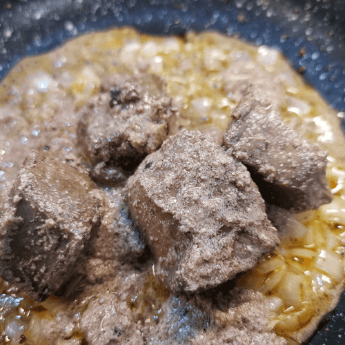 Добавить печень и убавить огонь до среднего.