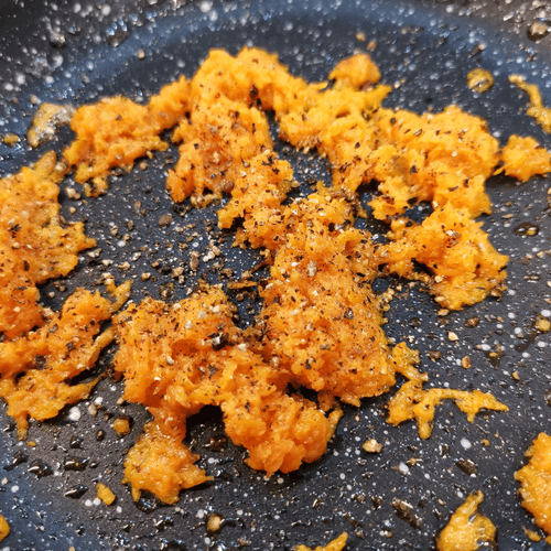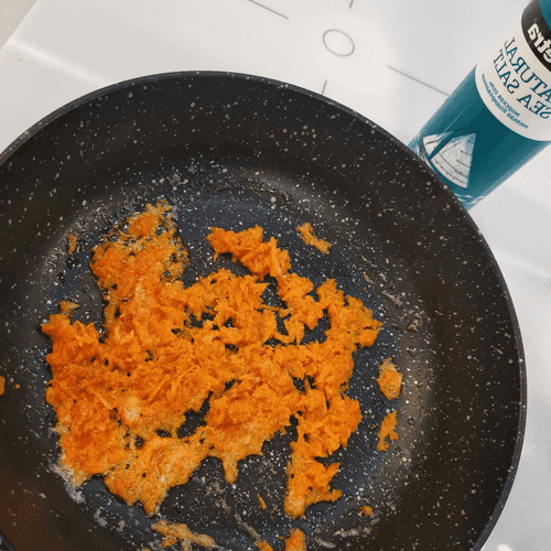 Морковь натереть на мелкой терке и выложить на сковороду, посолить.