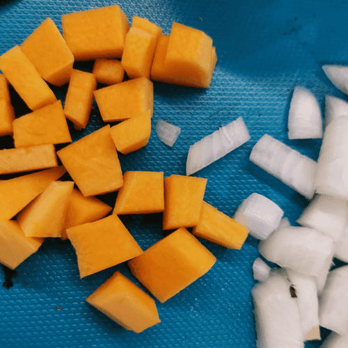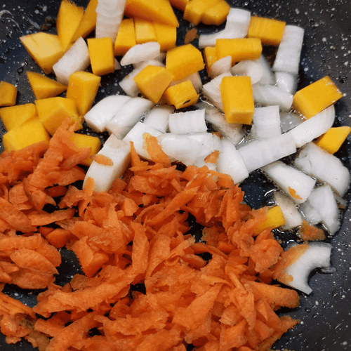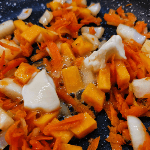 Раскалить сковороду с маслом и выложить морковь, лук и тыкву.