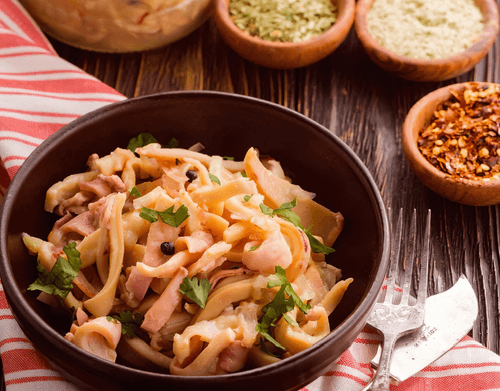 Кальмары, томленные в банке — это оригинальное блюдо русской кухни, которое сочетает простоту приготовления и удивительную глубину вкуса. Исторически способ томления в банке использовался для сохранения мягкости и насыщенности ароматов продуктов. Нежные полоски кальмаров медленно томятся в растительном масле с луком и чесноком, впитывая тепло специй — лаврового листа и черного перца. Процесс томления при низкой температуре позволяет кальмарам сохранить сочность и приобретать богатый вкус без излишней жесткости. Блюдо подается охлажденным, словно изысканная закуска, идеально сочетающаяся с ржаным хлебом и свежими овощами. Его тонкий морской аромат, слегка пряный вкус и нежная текстура делают кальмаров, томленных в банке, великолепным выбором для праздничного стола или уютного ужина в семейном кругу.
