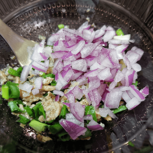 Яйца мелко нарезать и добавить к остальным ингредиентам. Немного посолить и перемешать.