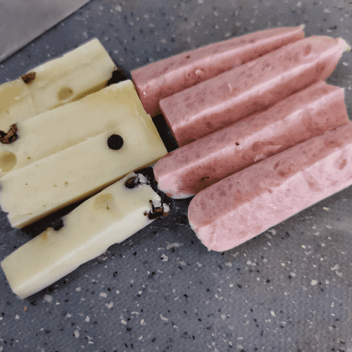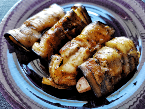 Баклажаны через 3 минуты снять с огня, немного остудить. Затем обернуть каждым слайсом кусочек сыра и ветчины.