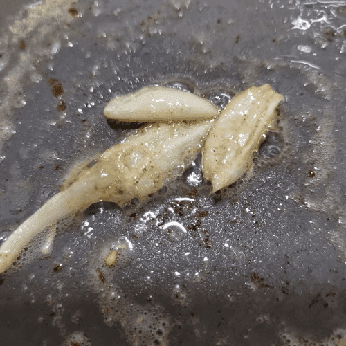 На сковороде растопить сливочное масло и добавить раздавленный чеснок.