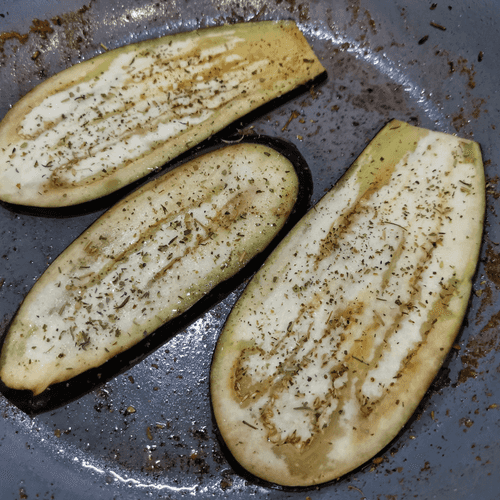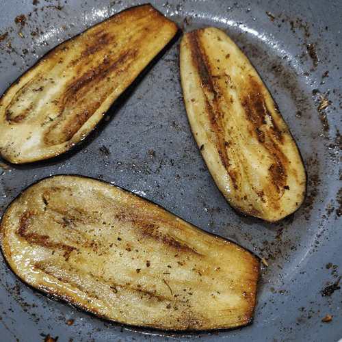 Выложить на сковороду баклажан, удалив подрумянившийся чеснок. Приправить травами и солью.