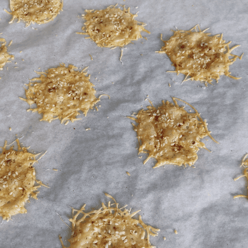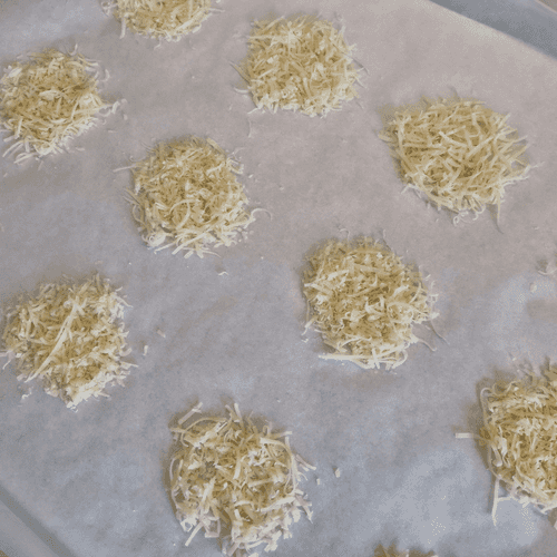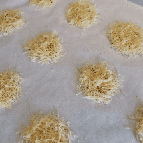 Выложить на пергамент кучки из тертого сыра. Примерно 1 столовую ложку на каждую.