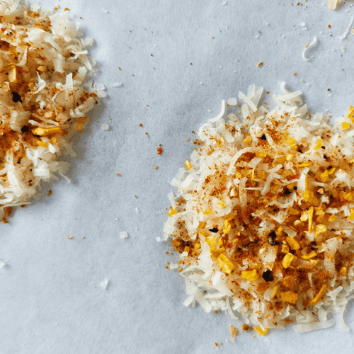 Затем добавить черный перец и чесночный порошок. Отправить в духовку на 7 минут при 180 градусах.