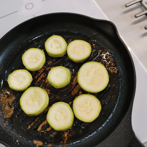 Выложить на сковороду гриль кабачок, нарезанный кружочками (толщиной около 7 мм) в разогретое масло.