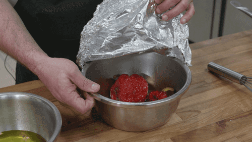 Отправить перцы на 15–20 минут в духовку, разогретую до 180–200 градусов. Готовые перцы вытащить из духовки, накрыть фольгой и дать им остыть. После этого снять кожицу.