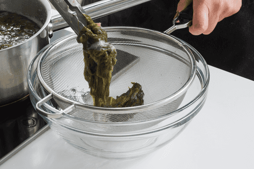 Готовый щавель откинуть на сито, чтобы стекла лишняя вода.