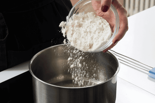 В кастрюле спассеровать масло с мукой.